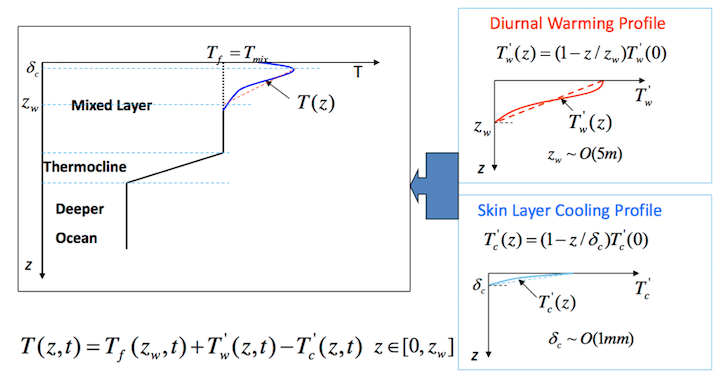 At the forecast step, Near-Surface Sea Temperature (NSST) is an oceanic vertical temperature profile just below the sea surface. Here, only the vertical thermal structure due to diurnal thermocline layer warming and thermal skin layer cooling is resolved, both with an origin on Fairall et al. (1996) [57] .