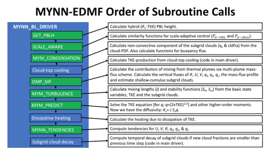 The MYNN-EDMF scheme has been extensively developed to improve upon the forecast skill of the original MYNN, largely driven by requirements to improve forecast skill in support of the NOAA's National Weather Service (NWS), the Federal Aviation Administration (FAA) and users within the renewable-energy industry.Specifically, fundamental changes were made to the formulation of the mixing lengths and representation of subgrid-scale(SGS) clouds, but new components have also been added to improve the representation of non-local mixing, the turbulence interaction with clouds, and the coupling to other model components (i.e., radiation). A description of the changes to the MYNN scheme are available in Olson et al.(2019) [156].